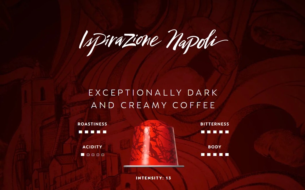 Ý không phải là nơi sáng tạo ra cà phê, cũng không phải là một vựa cà phê lớn của thế giới. Thế nhưng, nếu không có Ý thì nền văn hóa cà phê cũng không tồn tại, cũng sẽ chẳng có Starbuck hay một nền cà phê thú vị và rộng mở như ngày nay. Và ngược lại, nếu không có cà phê thì có lẽ nước Ý cũng sẽ dừng hoạt động. Và nếu nhắc đến cà phê Ý mà bỏ qua Napoli (Naples) thì thật đáng tiếc, nơi mà ly “espresso alla napolitana” (espresso phong cách Naples) là đại diện cho hình ảnh của thành phố ven biển miền Nam nước Ý với những đặc tính đặc trưng của ly espresso đậm chất Ý: mạnh mẽ, đậm đà, body dày sánh mịn với lớp crema ngả nâu sậm. Và Nespresso ispirazione Napoli với việc lấy cảm hứng từ thành phố ven biển Tyherrnus (Địa Trung Hải) đã cho ra một viên nén cà phê với độ đậm cao nhất mà hãng có thể đạt đến để đem lại một cảm giác trung thực nhất về một ly Espresso alla napolitana đến với người dùng.
